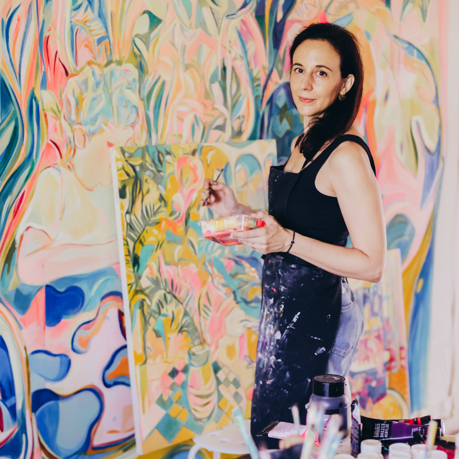 Emi Avora’s paintings are a collision of color, light, and symbolism—where reality meets dreamlike distortions. Born in Greece and currently based in Singapore, she channels her dual cultural experiences into compositions that blur the line between observation and imagination. Her subjects range from interiors and landscapes to objects that hold personal or cultural significance, merging the mundane with the extraordinary.