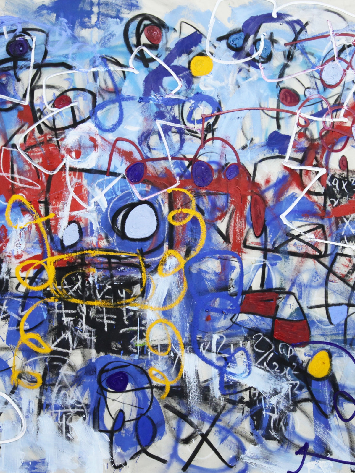 This spontaneous practice grew from Jaoui's background in theater and performance art, where accessing raw emotion was key. Painting became his tool for unlocking those feelings before taking the stage. Over time it transformed into his central passion, though inherently impulsive. Jaoui's primitivist-inspired artistic process demands rigorous planning, carefully controlling the dance between chance gestures and geometric intent. His large mixed media works on canvas capture a raw physical energy.