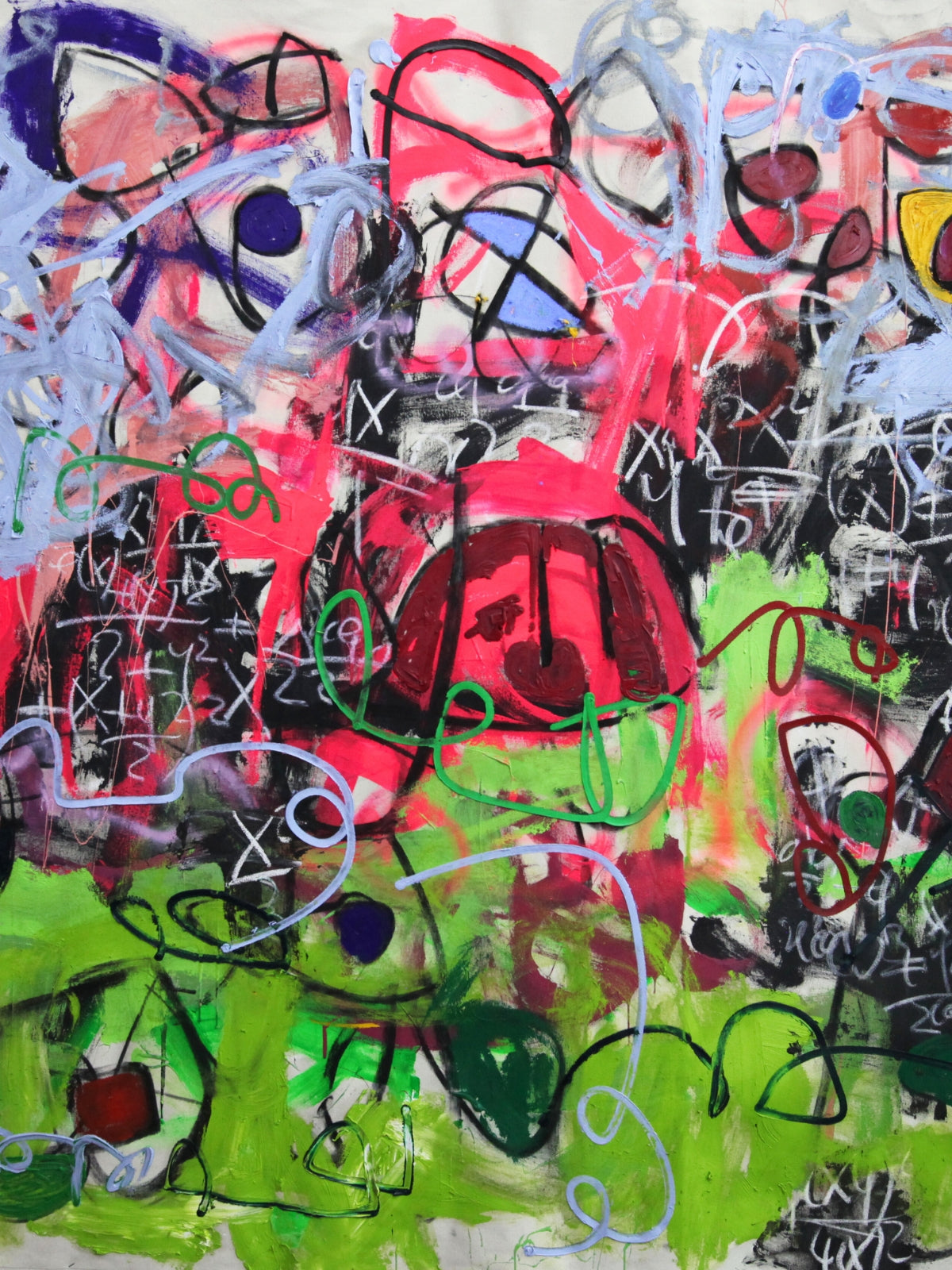 Tunisian artist Taher Jaoui approaches painting as a dance with the canvas, responding intuitively to the layered flow of vibrant pigment, expressive markings, and mathematical symbols. Jaoui compares the act of creating to moving with a familiar partner, letting his unconscious guide the abstract expressionist composition while drawing on his deep knowledge of artistic techniques.