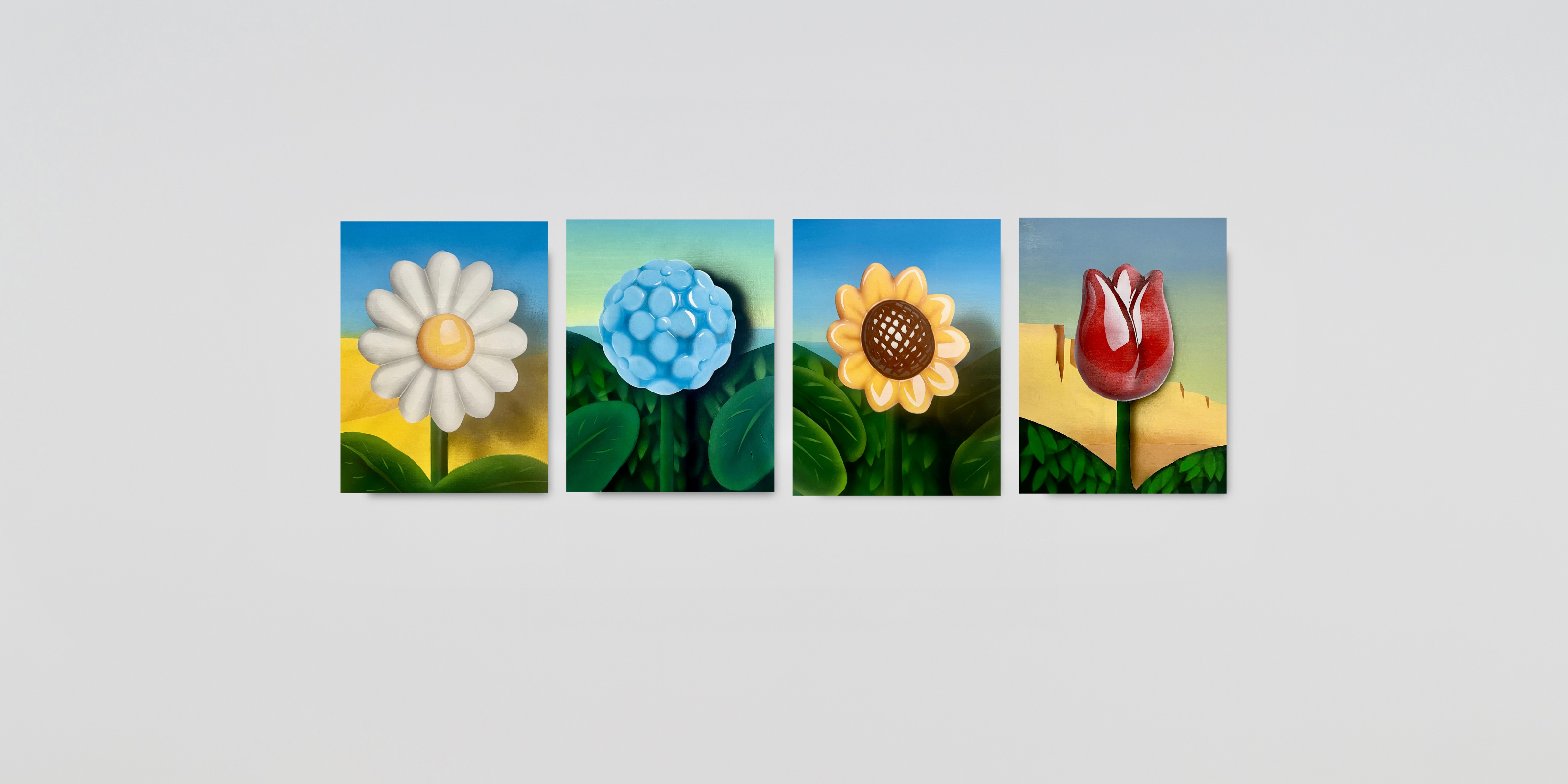 His creative process bridges the digital and the tangible: photographing, 3D modeling, experimenting with textures and colors, before translating them onto canvas with acrylic and airbrush. This transition from virtual to manual allows for images that are at once precise and dreamlike, evoking a reimagined garden suspended between worlds.
